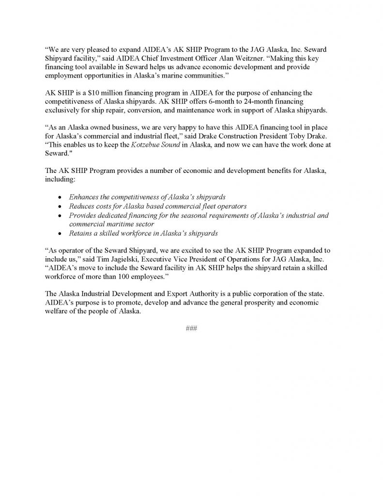 The first resolution expands the availability of AK SHIP to finance commercial ship repair and overhaul work at shipyards in the state other than Alaska Ship & Drydock in Ketchikan, where the program was launched in June 2019. The second resolution provides a new funding commitment of up to $1.5 million to Drake Investments LLC, for repair work under contract with JAG Alaska, Inc., operator of the Seward Shipyard.